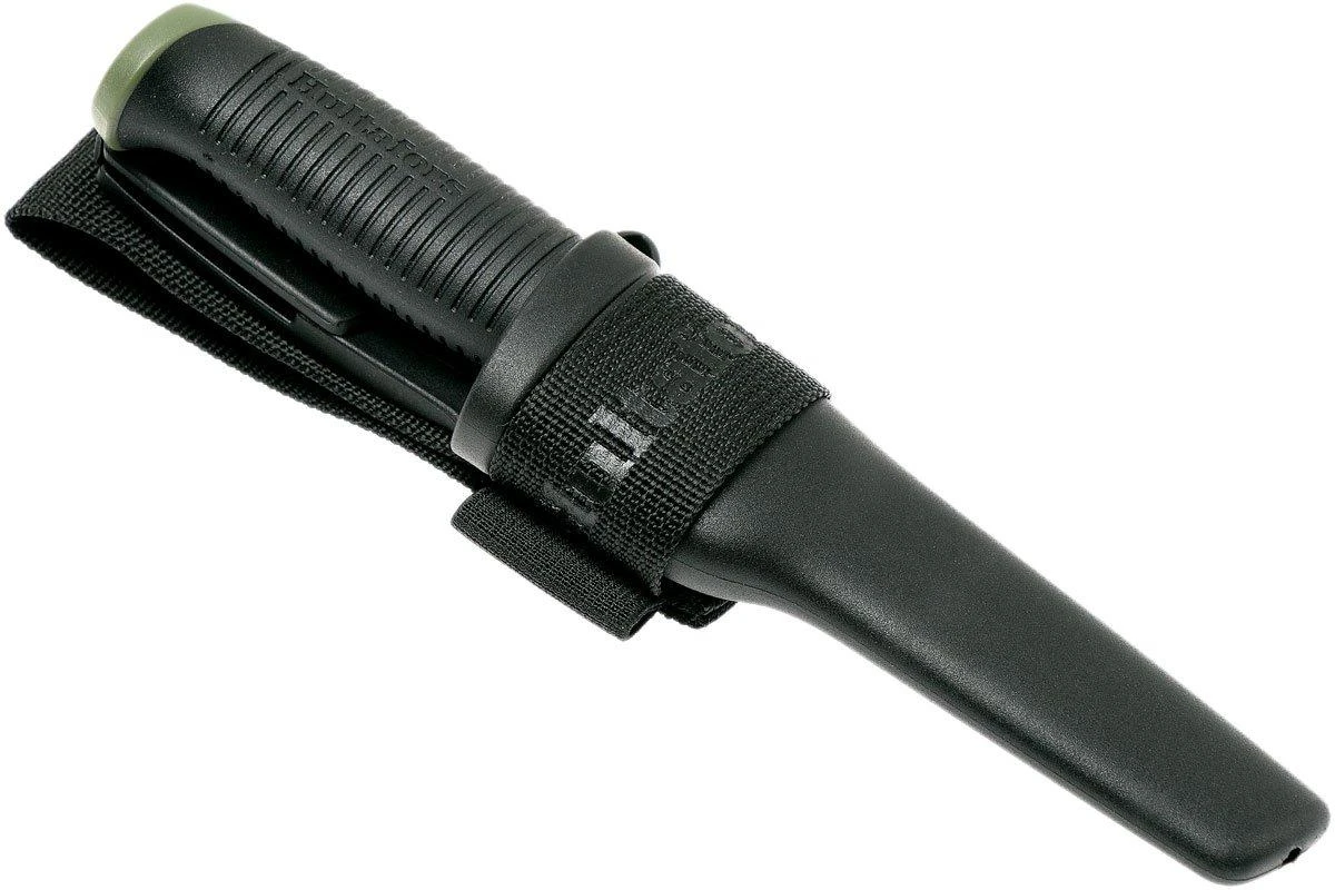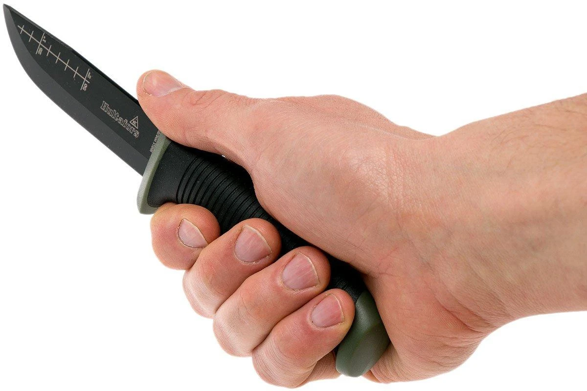 El cuchillo de exterior Ok4 de Hultafors es un popular cuchillo fijo de bushcraft. Su aspecto es similar al cuchillo Craftsman’s knife GH, pero está optimizado para su uso en exteriores. El revestimiento negro protege la hoja de acero al carbono de la corrosión. La parte posterior de la hoja es plana, para que funcione mejor con un yesquero. Una regla de cinco centímetros de longitud está grabada en el lateral de la hoja. El Hultafors OK4 es una opción ideal y asequible para la caza, la supervivencia y otras actividades al aire libre.