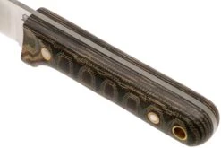 El LT Wright Next Gen es un cuchillo bushcraft moderno y popular, fabricado en Estados Unidos. En cuanto a las formas, es un poco como el arquetípico cuchillo bushcraft: simple pero bueno. El mango parece sencillo, y lo es. Al fin y al cabo, lo sencillo funciona. Tienes suficiente agarre sobre este «palo de escoba», independientemente de cómo lo sujetes. Ya sea para hacer cortes, cortar plumas o cocinar. Los recortes profundos en la parte delantera del mango y en el lateral son perfectos para el pulgar. Es ideal durante un movimiento de corte de «palanca de pecho», o al destripar la caza. De este modo, siempre estarás seguro al 100% de cómo sujetar el cuchillo. Incluso en la oscuridad.