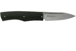 La Maserin Stralight 392/KT es una navaja ligera con un diseño excéntrico. La forma del mango parece poco ortodoxa. ¿Se siente bien en la mano? ¡Sí! Los dedos índice y corazón tienen suficiente agarre y el anular y el meñique se cierran bien alrededor del mango. Lo más destacable de este cuchillo es que la hoja está realzada con oro de 24 quilates.