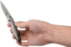 La Mcusta MC-0031D Shinra Kasumi es una esbelta navaja con mango de acero de Damasco. Los revestimientos de acero son parcialmente visibles, lo que da a la navaja un aspecto muy distintivo. Este aspecto único se ve reforzado por el acero ligeramente martillado utilizado para los revestimientos. El acero de Damasco también ofrece un relieve.