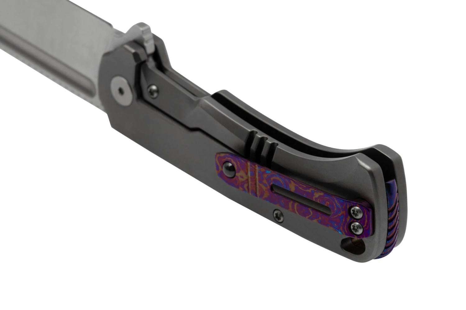La QSP Knife Rhino es igual que un rinoceronte: robusta, maciza, gris y más rápida de lo que imaginas. Gracias al flipper, el flipper frontal y la gran ranura para el pulgar, puedes abrir la hoja superrápidamente de la forma que prefieras. Una vez abierto, un sólido cierre frame lock mantiene la hoja firmemente en su sitio. El bonito backspacer y el clip de bolsillo son de MokuTi, un damasco de color púrpura hecho de titanio, que añade un toque elegante a esta robusta navaja EDC.