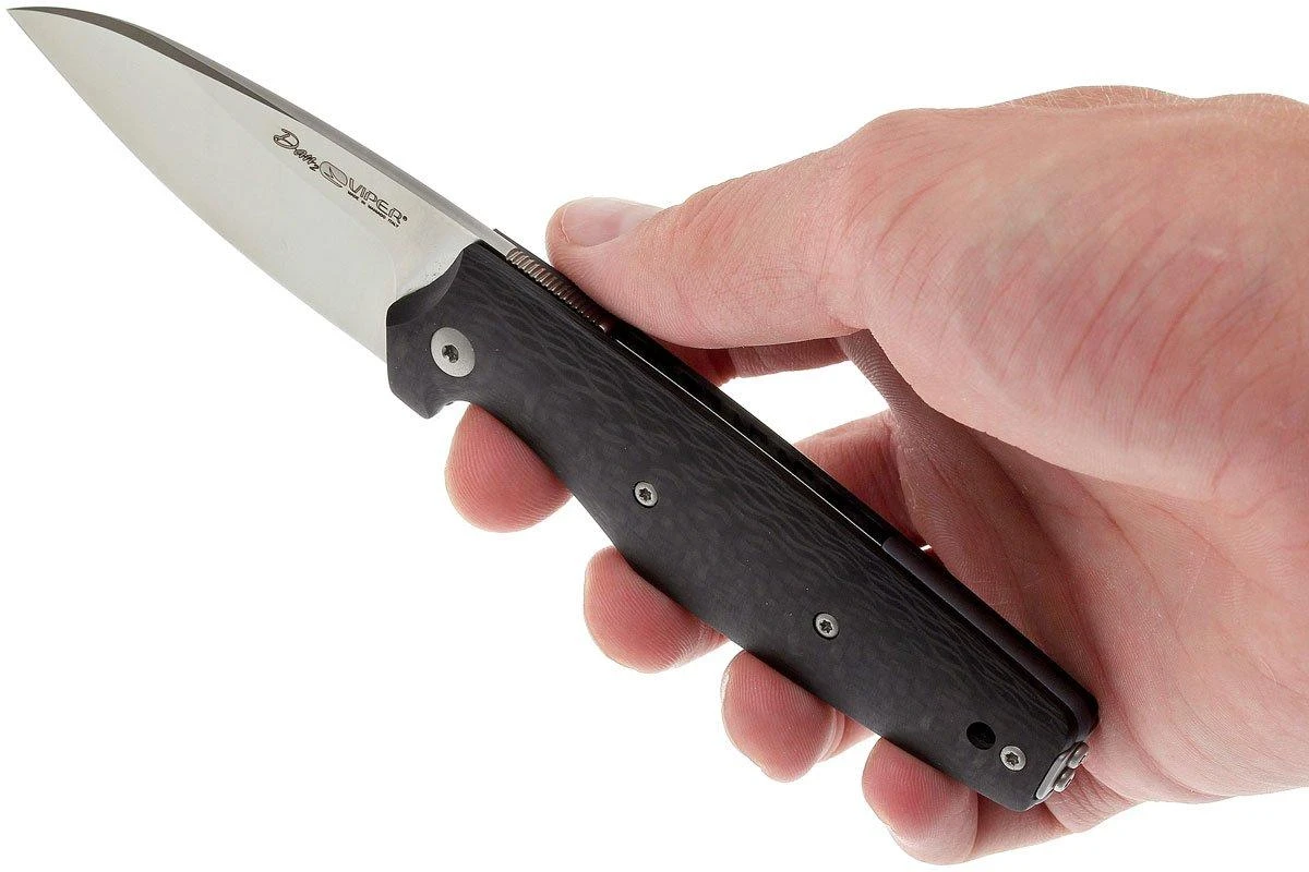 La Viper Dan 2 es una elegante friction folder con un bonito clip de bolsillo. Una friction folder es una navaja plegable sin mecanismo de bloqueo real. Sin embargo, se nota cierta resistencia en la hoja que impide que se cierre. El flipper delantero abre el cuchillo fácilmente. En posición abierta, el flipper se encuentra en la parte posterior de la hoja, donde estaría el pulgar. Al presionar el pulgar, la hoja se mantiene abierta durante su uso. Las Friction folders son populares en el Reino Unido y Alemania porque pueden llevarse legalmente. Además, por supuesto, también es un mecanismo hermoso que muchas personas consideran un gran activo.